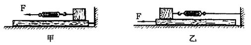 甲方案:在水平实验桌面上将木板用线拉住,通过弹簧测力计沿木板方向水平拉木块,使木块在木板上面滑动。
