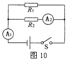18.如图10所示电路,两只电流表的规格相同,电流表有两个量程(0-0.6A和0-3A)。闭合S,电阻R1与R2均有电流流过,两只电流表的指针偏转角度相同,则U1∶U2= ,R1∶R2= 。