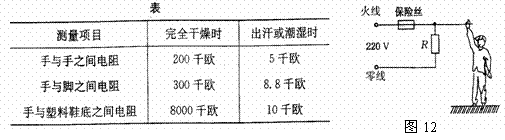 20.现代家庭电器化程度越来越高,用电安全是一个十分突出的问题。下表提供了一组人体电阻数据。如图12所示,用电器R接在电压为220V的电源上时,消耗的电功率是1100W,电路中还有额定电流为10A的熔丝(俗称保险丝)。则: