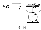 在飞机设计、制造过程中,要进行风洞实验,用来搜集分析有关数据。在江苏省科学宫内,有一个风洞实验室,一架飞机模型固定在托盘测力计上,如图14所示。当无风时托盘测力计的示数为15N;当迎面吹着飞机的风速达到20m/s时,托盘测力计的示数为7N。托盘测力计示数减小的原因是气体在流速大的地方压强 ;此时飞机模型受到的升力为 N。