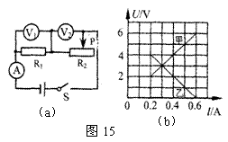 如图15-a所示的电路,电源电压保持不变。闭合开关S,调节滑动变阻器,两电压表的示数随电路中电流变化的图线如图b所示,根据图线的信息可知: (选填“甲”或“乙”)是电压表V2示数变化的图线,电源电压为 V,当滑片滑到最右端时,电阻Rl在5分钟内产生的热量为 J。