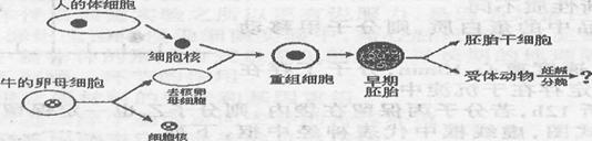 37.(徐州市09届高三第二次调研29.)(7分)英国纽卡斯尔大学约翰·伯恩教授领导的研究小组2008年4月1日宣布,他们已从人的皮肤细胞中提取出细胞核,然后将其植入几乎被完全剔除了遗传信息的牛卵细胞或兔卵细胞中,从而培育出人兽混合胚胎(如图所示)。该胚胎发育到第三天时已含有32个细胞,研究人员希望它能继续生长到六天,再从胚胎中取出干细胞供医学研究使用。