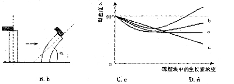 5. 某研究小组探究避光条件下生长素浓度对燕麦胚芽鞘生长的影响。胚芽鞘去顶静置一段时间后,将含有不同浓度生长素的琼脂块分别放置在不同的去顶胚芽鞘一侧,一段时间后测量并记录弯曲度(α)。左下图为实验示意图。右下图曲线中能正确表示实验结果的是