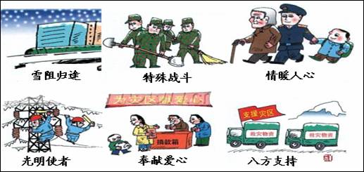 春节期间,我国南方多个地区遭受几十年来罕见的雪灾。它给人们的生产和生活带来了极大的影响--房屋倒塌,断水断电,食品供应紧张……。面对灾害,举国上下齐心协力抗击雪灾,展示了强大的中国精神。请结合下图用英语为China Daily写一篇简短的报道。