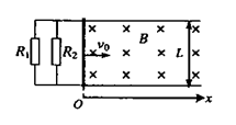 20.(12分)如图所示,两条足够长的互相平行的光滑金属导轨位于水平面内,距离为L=0.5m。在导轨的一端分别接有阻值均为0.6Ω的电阻R1、R2,在x≥0处有一与水平面垂直的匀强磁场,磁感应强度B=1T。一质量m=0.2kg的金属杆垂直放置在导轨上,金属直杆的电阻是r=0.2Ω,其他电阻忽略不计,金属直杆以一定的初速度v0=4m/s进入磁场,同时受到沿x轴正方向的恒力F=3.5N的作用,在x=2m处速度达到稳定。求: