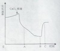 (3)赤霉素促进茎的伸长主要与细胞壁的伸展性有关。有人进 行了CaCl2和赤霉素对某植物种子胚轴生长速率影响的实验,结果如右图所示。由图分析可知,一定浓度的CaCl2溶液对细胞壁的伸展起 作用;加入赤霉素溶液的时间在图中的 (A点、B点、C点)。根据上述实验分析赤霉素促进茎伸长的可能原因是 。