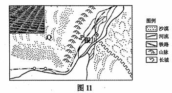 图11是我国西部某地区略图,图中左上方所示为当地铁路沿线的草方格沙障。读图回答21-22题。![]()