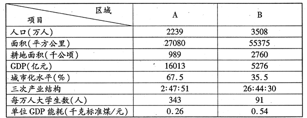 (1)从题干及表格数据,A区域地处沿海,交通便利;GDP16013亿元,经济发达;大学生比例高,劳动力素质较高,同时,单位GDP能耗低,反映科技较为发达;二三产业比重高,产业结构成熟。B区域煤铁资源丰富;耕地资源较A多;人口众多,大学生比例低,则拥有大量廉价劳动力。