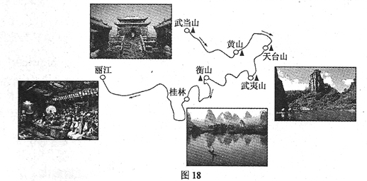 C.[旅游地理]小王参加了“重走霞客路”的旅行考察活动。他们从湖北武当山出发,到云南丽江结束。图18是考察路线示意图及相关景观图。读图回答下列问题。(10分)