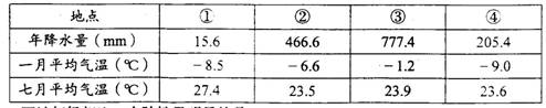 下表是我国北纬35°―40°之间大陆上四地的气候资料。读下表,回答13-14题。