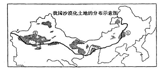 (2)图中数字表示了我国两个沙漠化严重的地区,其中
