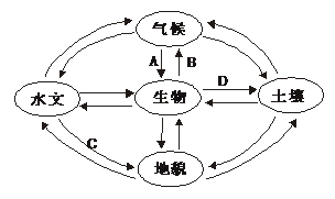 (2)图中A、B、C、D箭头中,表示形成黄土高原千沟万壑地质作用的是 ,表示不同温度带生长植物不同的是 ,表示绿地对城市空气净化作用的是 ,表示植被破坏引起土壤肥力下降的是 。(填字母,否则不得分)