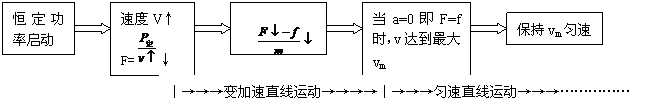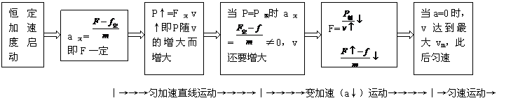 (2)特别注意匀加速起动时,牵引力恒定.当功率随速度增至预定功率时的速度(匀加速结束时的速度),并不是车行的最大速度.此后,车仍要在额定功率下做加速度减小的加速运动.(这阶段类同于额定功率起动)直至a=0时速度达到最大.具体变化过程可用如下示意图