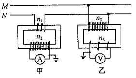 19.如图所示,M、N是输电线,甲是电流互感器,乙是电压互感器。已知![]()