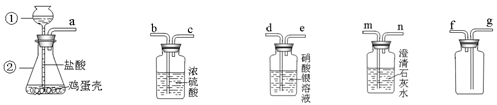 (3)D D装置中澄清石灰水变浑浊(1分)CO2 + Ca(OH)2 = CaCO3↓ + H2O (4)a接d,e接b,c接g(2分) 除去CO2中混有的HCl气体 AgNO3 + HCl = AgCl ↓+ HNO3
