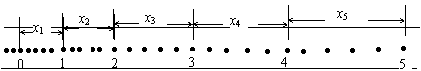 的时间 s为时间单位,在纸带上选好的计时点下面标0,在第 点下面标1,在第 点下面标2……,标明的点叫计数点,则相邻的计数点时间间隔为 (如下图所示),两相邻点间的距离分别是x1、x2、x3…………