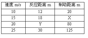 为了安全,汽车在行驶途中,车与车之间必须保持一定的距离,这是因为从驾驶员看见某一情况到采取制动动作的反应时间里,汽车仍然要通过一段距离(称为反应距离),而从采取制动动作到汽车停下的时间内,汽车也要通过一段距离,称为制动距离,下表中列出了在不同速度下的反应距离和制动距离的部分数据,根据分析计算,表中未给出的数据X、Y应是: