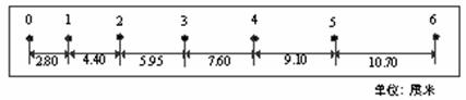 (2)如果选出的纸带如图所示,图中共有0-6七个记数点,已知每两个记数点间有4个记时点,从纸带分析可以求得的加速度a= 米/秒2.打第四号点时的速度为_________米/秒。(小数点后保留两位有效数字)