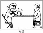 答案 示例:两人在“对话”,一人头部是一张口水四溅的大嘴,另一人头部是一只洗耳恭听的大耳朵。漫画讽刺了假“民主”实“专制”(或“一言堂”)的官僚作风。(要突出“嘴”和“耳朵”,点明作风特点。可用成语有“喋喋不休”“洗耳恭听”“盛气凌人”“毕恭毕敬”“战战兢兢”等)
