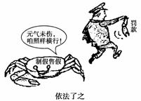 答案 这幅题为“依法了之”的漫画,形象地讽刺了某些治标不治本的处罚行为。画面上,一个身着制服的执法人员提着一只从标有“制假售假”字样的螃蟹身上折断的一只蟹钳,得意扬扬地走了,而那只被处罚的螃蟹心存侥幸,心里想着“元气未伤,咱照样横行”。提示人们:对违法乱纪者,必须严厉打击,做到斩草除根。整个画面图案简洁,形象生动。