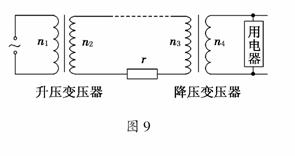 10.(2009·山东高考)某小型水电站的电能输送示意图如图9所示,发电机的输出电压为200 V,输电线总电阻为r,升压变压器原、副线圈匝数分别为n1、n2,降压变压器原、副线圈匝数分别为n3、n4(变压器均为理想变压器).要使额定电压为220 V的用电器正常工作,则 ( )