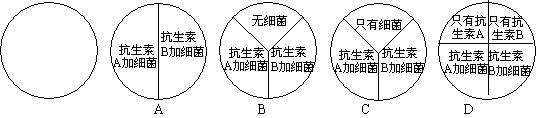 28.若将某种细菌置于有营养的物体上,它会繁殖并形成细胞群(如下图)。下列实验可以用来检验两种抗生素的杀菌效用的是 ( )