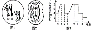 (2)图1细胞中染色体①与②的分离发生在图3的 时期。若该细胞完成减数分裂后,形成了一个基因型为DA的子细胞,则同时产生的其他子细胞的基因型分别是 。