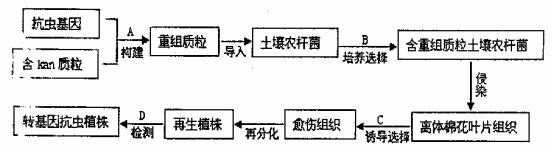 (3)由图中离体棉花叶片组织获得转基因抗虫植株可采用 技术,该技术所依据的原理是 。