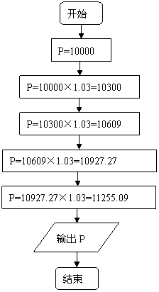 例6.有关专家建议,在未来几年内,中国的通货膨胀率保持在3%左右,这将对我国经济的稳定有利无害。所谓通货膨胀率为3%,指的是每年消费品的价格增长率为3%。在这种情况下,某种品牌的钢琴2004年的价格是10 000元,请用流程图描述这种钢琴今后四年的价格变化情况,并输出四年后的价格。