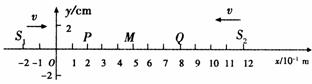 13.(08天津市和平区第二学期第一次质量调查)如图所示,均匀介质中振动情况完全相同的两波源S1 、S2分别位于x1=-2×10-1 m和x2=12×10-1 m处.t =0时刻以频率为f =10 Hz同时开始向上振动,振幅为A=2 cm,波的传播速度为v=4 m/s,P、M、Q三质点的平衡位置离O点距离分别为OP=0.2 m、OM=0.5 m、OQ=0.8 m.则下列关于各质点运动情况判断正确的是 ( )