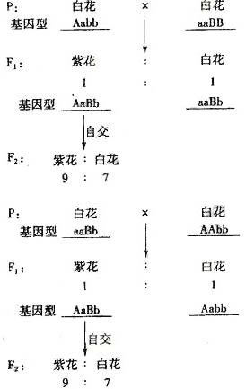 A和a、B和b是分别位于两对染色体上的等位基因,A对a、B对b为显性。基因型不同的两白花植株杂交,F1紫花∶白花=1∶1。若将F1紫花植株自交,所得F2植株中紫花:白花=9∶7