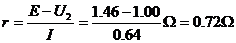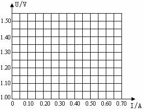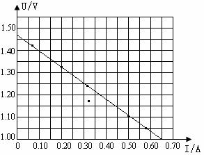 (2)根据表格中U、I数据,在方格纸U-I坐标上找点描迹如图,连直线时第四组数据(0.32A,1.18V)标出的点应该舍去不顾,然后将直线延长,交U轴于U1=1.46V(1.44-1.48也对),此即为电源电动势;交I轴于I=0.64A,注意此时U2=1.00V,由闭合电路欧姆定律得。测得(0.67-0.77也对)。