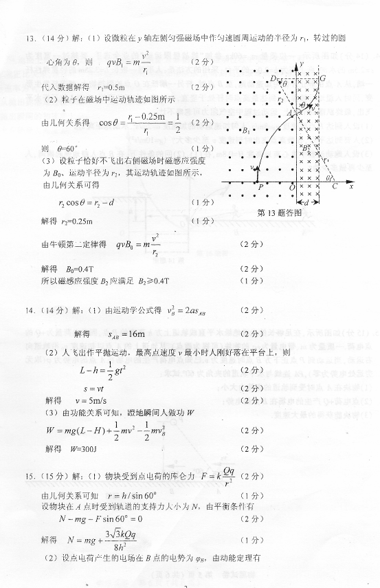 13.(14分)如图所示的坐标平面内,在y轴的左侧存在垂直纸面向外、磁感应强度大小B1=0.20T的匀强磁场,在y轴的右侧存在垂直纸面向里、宽度d=12.5cm的匀强磁场B2.某时刻一质量m=2.0×10-8kg、电量q=+4.0×10-4C的带电微粒(重力可忽略不计),从x轴上坐标为(-0.25m,0)的P点以速度v=2.0×103 m/s沿y轴正方向运动.试求: