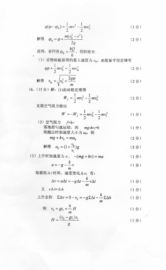 16.(15分)从地面上以初速度v0竖直向上抛出一质量为m的球,若运动过程中受到的空气阻力与其速率成正比关系,球运动的速率随时间变化规律如图所示,t1时刻到达最高点,再落回地面,落地时速率为v1,且落地前球已经做匀速运动.求: