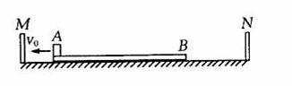20(19分).如图所示,质量为2kg的物块A(可看作质点),开始放在长木板B的左端,B的质量为1kg,可在水平面上无摩擦滑动,两端各有一竖直挡板M、N,现A、B以相同的速度v0=6m/s向左运动并与挡板M发生碰撞,B与M碰后速度立即变为零,但不与M粘接;A与M碰撞没有能量损失,碰后接着返向N板运动,且在与N板碰撞之前,A、B均能达到共同速度并且立即被锁定,与N板碰撞后A、B一并原速反向,并且立刻解除锁定.A、B之间的动摩擦因数