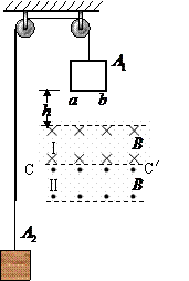 ( 15分)如图所示,轻绳绕过轻滑轮连接着边长为L的正方形导线框A1和物块A2,线框A1的电阻为R,质量为M,物块A2的质量为m(M>m),两匀强磁场区域I、II的高度也为L,磁感应强度均为B,方向水平与线框平面垂直。线框ab边距磁场边界高度为h。开始时各段绳都处于伸直状态,把它们由静止释放,ab边刚穿过两磁场的分界线CC/进入磁场II时线框做匀速运动。求: