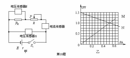 ③该图线斜率大小和温度的关系是 。 18.(9分)为了测定电源电动势E的大小、内电阻r和定值电阻R0的阻值,某同学利用DIS设计了如图甲所示的电路。闭合电键S1,调节滑动变阻器的滑动触头P向某一方向移动时,用电压传感器1、电压传感器2和电流传感器测得数据,并根据测量数据计算机分别描绘了如图乙所示的M、N两条U-I直线。请回答下列问题: