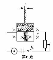 (6分)实验研究表明:在弹性限度范围内,弹簧所受弹力的大小与弹簧的形变长度成正比即F=kΔx,k为劲度系数,Δx为形变量。如图所示是一个可以用来测量磁感应强度的装置,其上部是一根粗细均匀截面积为S的细管子,下部是一个截面积为正方形(边长为L)的容器,其底部与大气相通,该容器左右两壁为导体,其他各面是绝缘的。容器内有一个正方形的金属活塞,其边长也为L,可在金属容器内无摩擦滑动,活塞下方有一轻质弹簧支撑着,已知弹簧的劲度系数为k,(实验中弹簧形变不超过弹性限度),活塞上部充满密度为ρ的绝缘油。容器的左右两壁与一电路连接,当被测磁场的磁感线垂直容器的外表面,闭合电键K后,竖直管中油柱的上表面的高度变化指示被测磁场的强弱。
