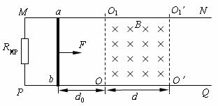 24.(14分)如图,光滑平行的水平金属导轨MN、PQ相距l,在M点和P点间接一个电阻RMP,其阻值为R,在两导轨间OO1O1′O′矩形区域内有垂直导轨平面竖直向下、宽为d的匀强磁场,磁感强度为B。一质量为m,电阻也为R的导体棒ab,垂直搁在导轨上,开始时在磁场边界OO1左边,与磁场左边界OO1相距d0。现用一大小为F、水平向右的恒力拉ab棒,使它由静止开始向右运动,棒ab在离开磁场前已经做匀速直线运动(棒ab与导轨始终保持良好的接触,导轨电阻不计)。求: