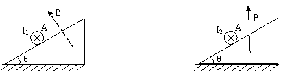 在同一光滑斜面上放同一导体棒A,下图所示是两种情况的剖面图。它们所处空间有磁感应强度大小相等的匀强磁场,但方向不同,一次垂直斜面向上,另一次竖直向上。当两次导体棒A分别通有电流I1和I2时,导体棒A均处于静止状态。已知斜面的倾角为θ,则两次斜面对导体棒A的弹力大小之比N1:N2= , 电流I1:I2= 。