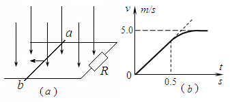 (14分)如图(a)所示,两根足够长的水平平行金属导轨相距为L=0.5m,其右端通过导线连接阻值R=0.6Ω的电阻,导轨电阻不计,一根质量为m=0.2kg、阻值r=0.2Ω的金属棒ab放在两导轨上,棒与导轨垂直并保持良好接触,金属棒与导轨间的动摩擦因数m=0.5。整个装置处在竖直向下的匀强磁场中,取g=10m/s2。若所加磁场的磁感应强度大小恒为B,通过小电动机对金属棒施加水平向左的牵引力,使金属棒沿导轨向左做匀加速直线运动,经过0.5s电动机的输出功率达到P=10W,此后电动机功率保持不变。金属棒运动的v-t图像如图(b)所示,试求: