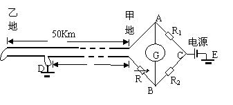 14.甲乙两地相距50km,其间有两条相同的电话线,在D处有一条因绝缘皮被老鼠咬破触地而发生故障。为了确定触地点到甲地的距离,甲地的检修人员先让乙地的工作人员把两条电话线短接,(图中D、E两点都接地,可以认为两点间用导线连接且电阻不计)然后调节电阻箱的阻值R,使通过理想电流表G的电流为零,R1=R2,此时电阻箱的阻值为360Ω,已知每1km电话线的阻值为6Ω,则触地点到甲地的距离为_______km;若把电阻箱R阻值调大,则通过电流表G的电流方向___________。