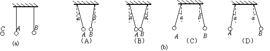 如图(a)所示,A、B为用两个绝缘细线悬挂起来的带电绝缘小球,质量mA<mB。当在A球左边如图位置放一个带电球C时,两悬线都保持竖直方向(两悬线长度相同,三个球位于同一水平线上)。若把C球移走,A、B两球没有发生接触,则(b)图中(图中α>β)能正确表示A、B两球位置的图是( )