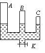 如图所示,上端封闭的连通器A、B、C 三管中水银面相平,三管横截面积关系为SA>SB>SC,管内水银面上方的空气柱长度为hA>hB>hC,若从下方通过阀门K流出少量水银(保持三管中仍有水银),则三管中水银面的位置关系为( )