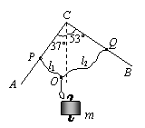 如图所示,ACB是一光滑的、足够长的、固定在竖直平面内的“∧”形框架,其中CA、CB边与竖直方向的夹角分别为37°和53°。P、Q两个轻质小环分别套在CA、CB上,两根细绳的一端分别系在P、Q环上,另一端和一绳套系在一起,结点为O。将质量为m的钩码挂在绳套上,OP、OQ两根细绳拉直后的长度分别用l1、l2表示,受到的拉力分别用F1和F2表示,则( )