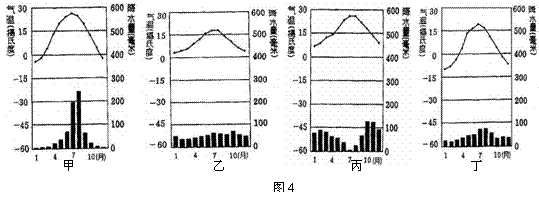 C.丙夏季高温少雨,冬季温和多雨 D.丁夏季高温多雨,冬季低温少雨