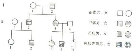 由图示难以推断甲病是显性还是隐性遗传病(不满足有中生无和无中生有的任何一个规律)。这样我们可以直接来看Ⅱ-2病而I-1未病(男病女未病),排除是伴X显性遗传病,Ⅱ-3病而Ⅲ-5未病(女病男未病),排除是伴X隐性遗传病,同时显然也不可能是伴Y遗传病,那么只能是常染色体上的遗传病。如果是常染色体的隐性遗传病,则Ⅱ-4为携带者,有致病基因,所以甲病是位于常染色体上的显性遗传病。乙病由I-1、I-2无乙病生出Ⅱ-2患乙病的(无中生有),判断乙病属于隐性遗传病,同样如果是常染色体上的隐性遗传病则Ⅱ-4为携带者,有致病基因,所以判断乙病是伴X隐性遗传病。进一步较易推断出Ⅱ-2的基因型是AaXbY,Ⅲ-1的基因型是aaXBXb,Ⅲ-2的基因型AaXBY, Ⅲ-3的基因型是1/2AaXBXb或1/2AaXBXB,这样分以下两种情况:①Ⅲ-2(AaXBY)与Ⅲ-3(1/2AaXBXb)生出正常的孩子的不完整的基因型为aaXB_,概率是1/2×1/4×3/4=3/32②Ⅲ-2(AaXBY)与Ⅲ-3(1/2AaXBXB)生出正常的孩子的不完整的基因型为aaXB_,概率是1/2×1/4×1=1/8,所以二者生出正常孩子的概率是3/32+1/8=7/32。