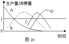 下图是某跨国公司产品在A、B、C、D四国的产量与消费量比值变化示意图,A、B是发达国家,C、D是发展中国家,读图20回答第47-48题。
