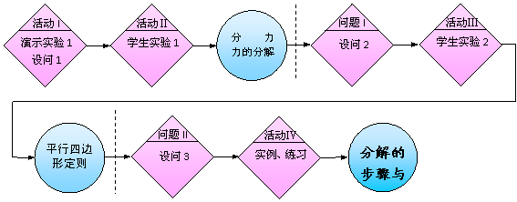 本设计要突出的重点是:分力、力的分解的概念和利用平行四边形定则进行力的分解。方法是:以生活中的常见现象入手,通过演示实验、学生分组实验,结合学生的亲身感受,从等效性的角度,通过分析、推理,建立分力和力的分解的概念,进而通过DIS学生分组实验得出力的分解同样遵循平行四边形定则。