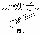 如图6所示, A、B二物体之间用轻质弹簧连结,用水平恒力F拉着A、B一起沿光滑水平面匀加速运动,这时弹簧长度为L1;若将A、B置于粗糙斜面上,用相同的沿斜面向上的恒力F拉动A,使A、B一起向上匀加速运动,此时弹簧长度为L2,若A、B与粗糙斜面之间的动摩擦因数相同,则以下关系式正确的是: